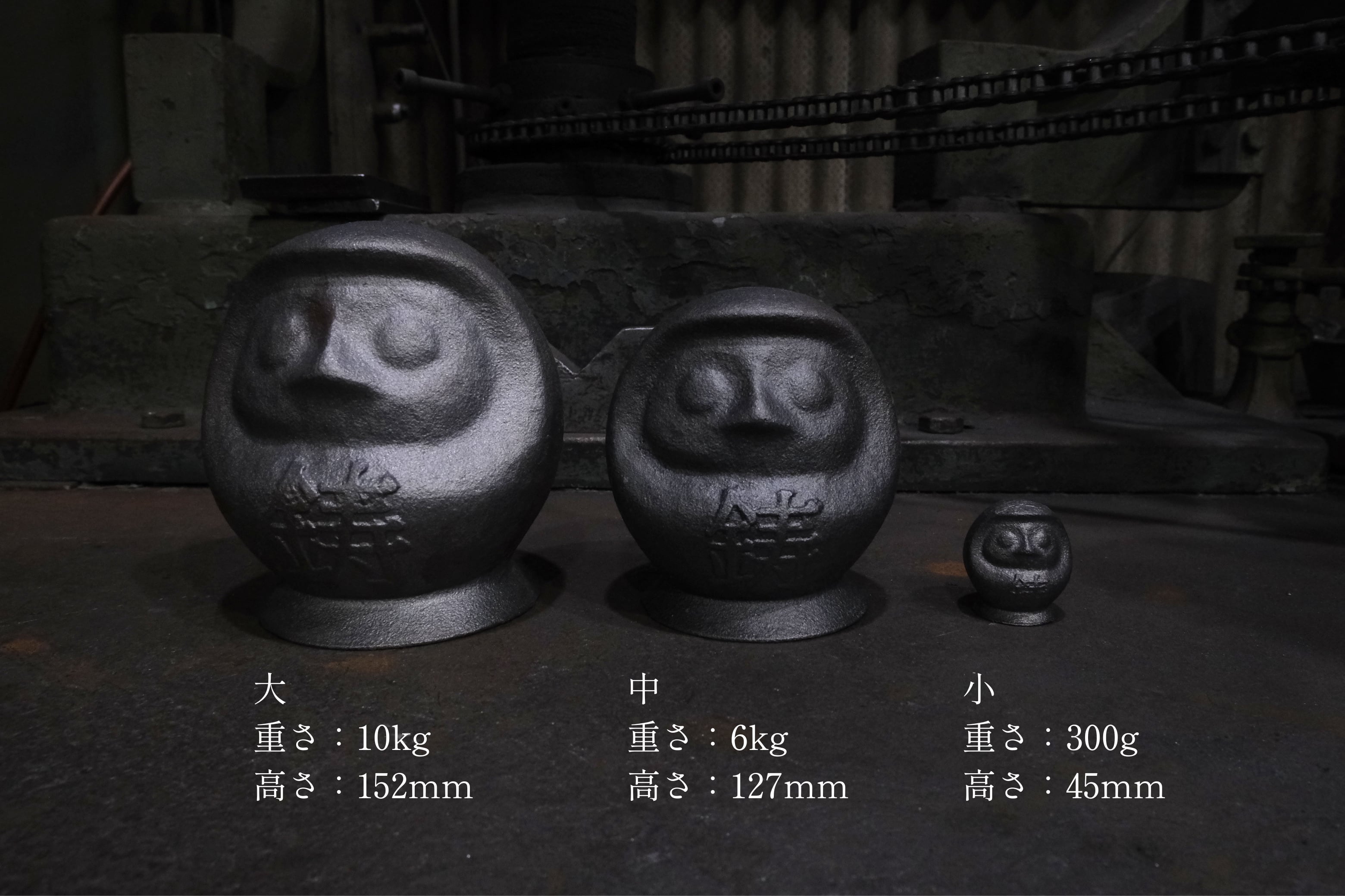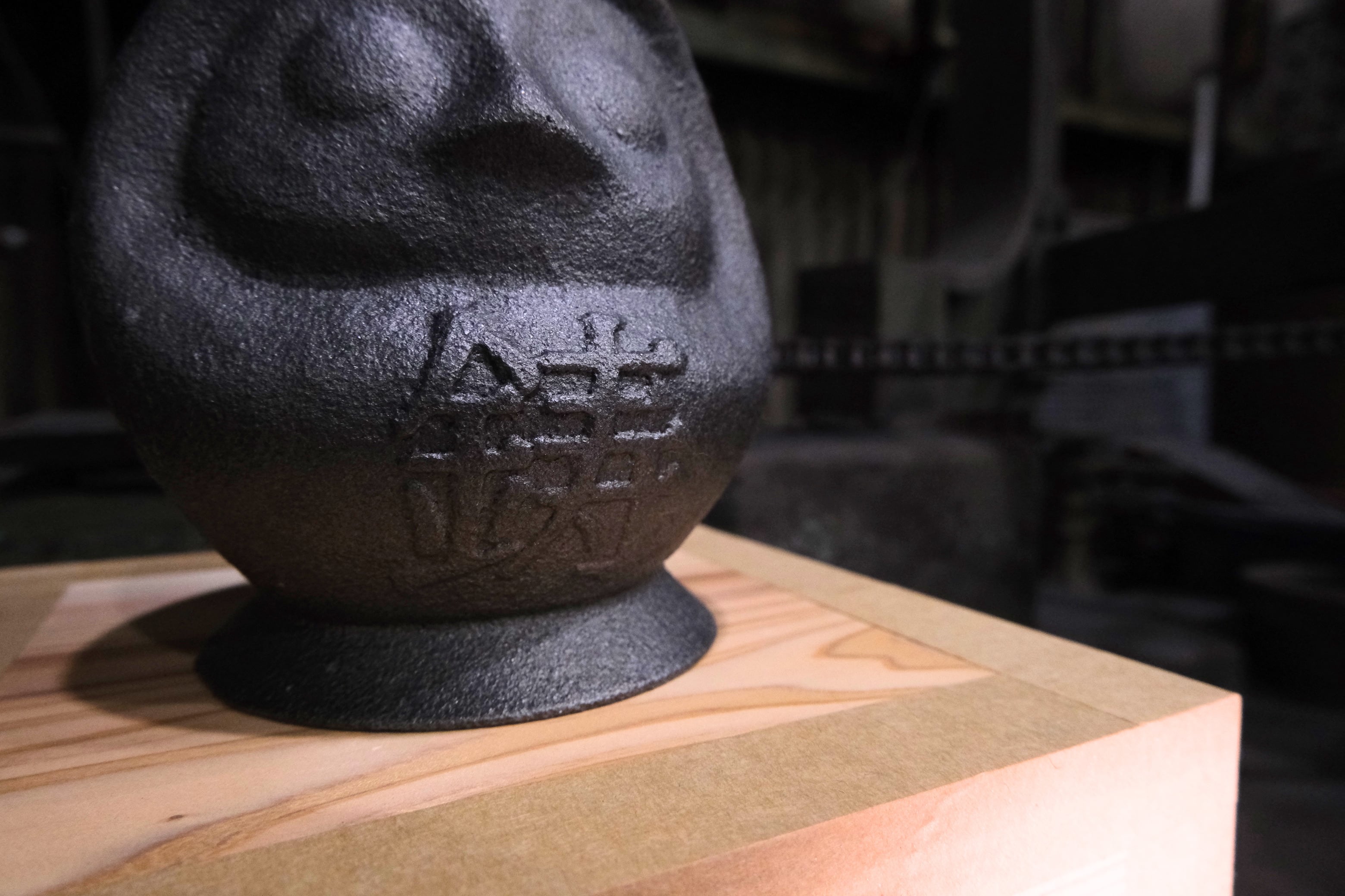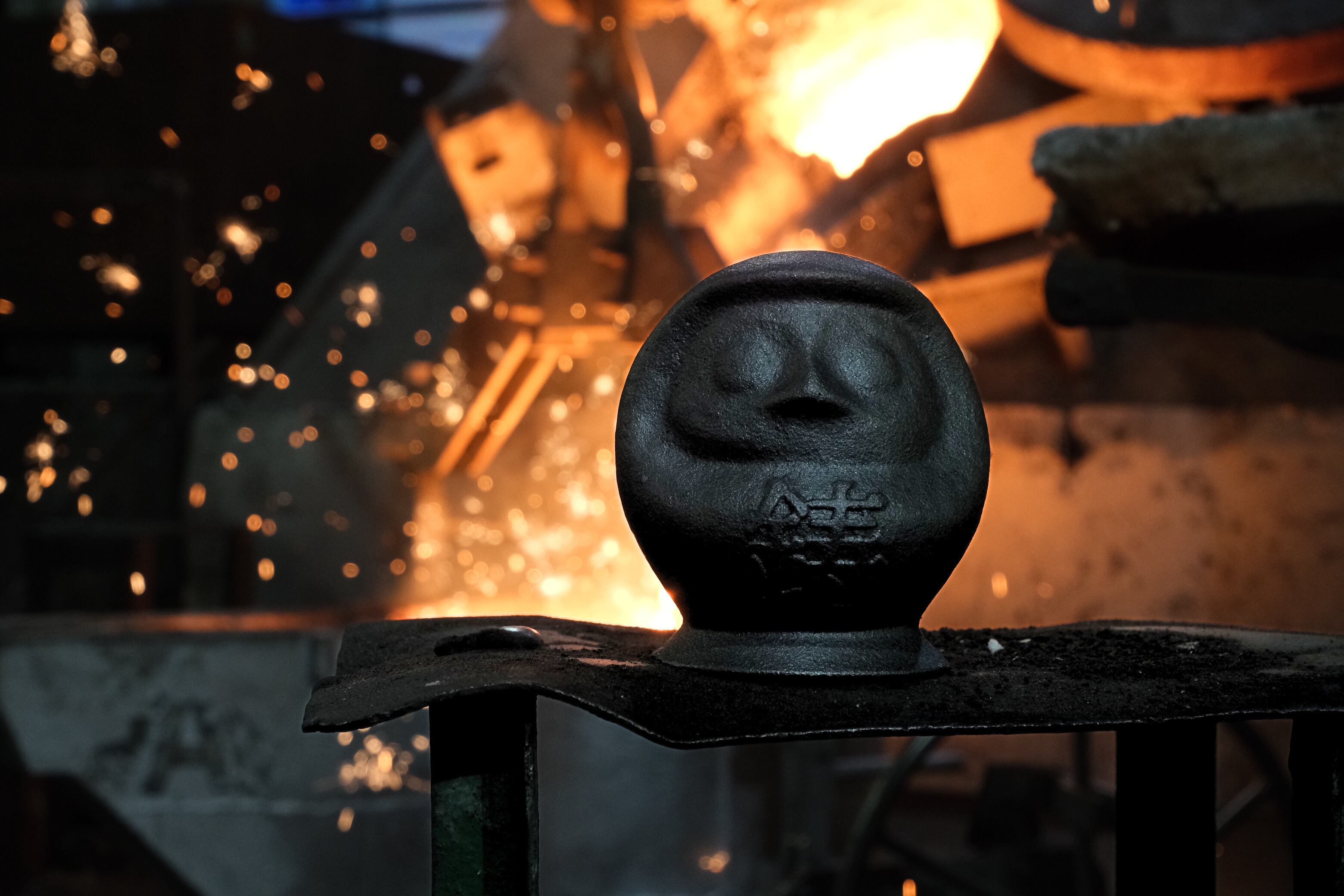 型から取り出した後は、職人が手作業でバリを取り、研磨し、だるまの表情を整えます。砂型鋳造特有の「鋳肌(いはだ)」の質感や、お腹の刻印の出方は、世界にたった一つ。